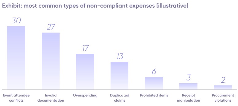 The findings reveal that 86% of expenses comply with company policy, leaving 14% of claims at risk. This 14% includes both errors, such as misclassified or incomplete claims, and intentional actions like duplicates or falsified receipts.